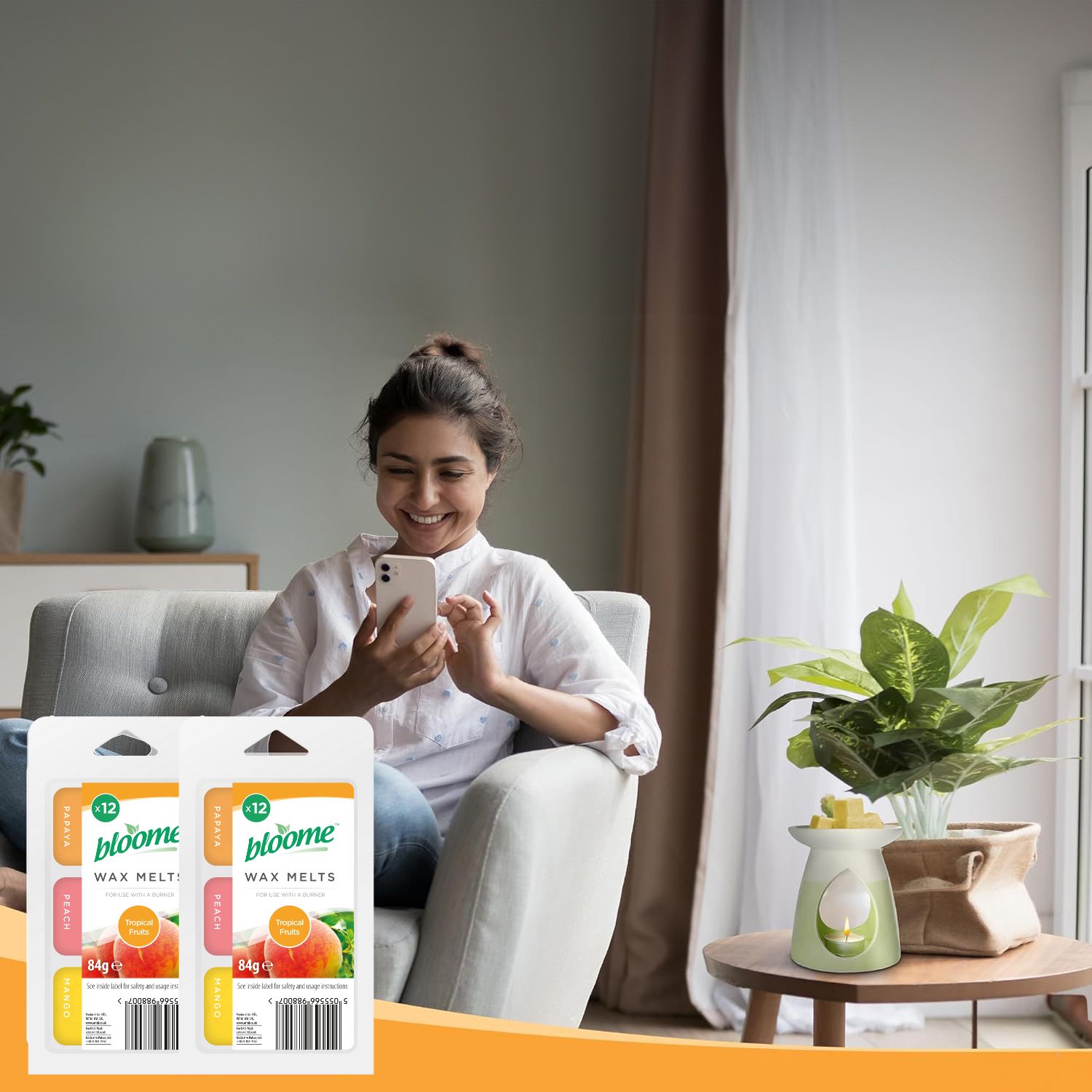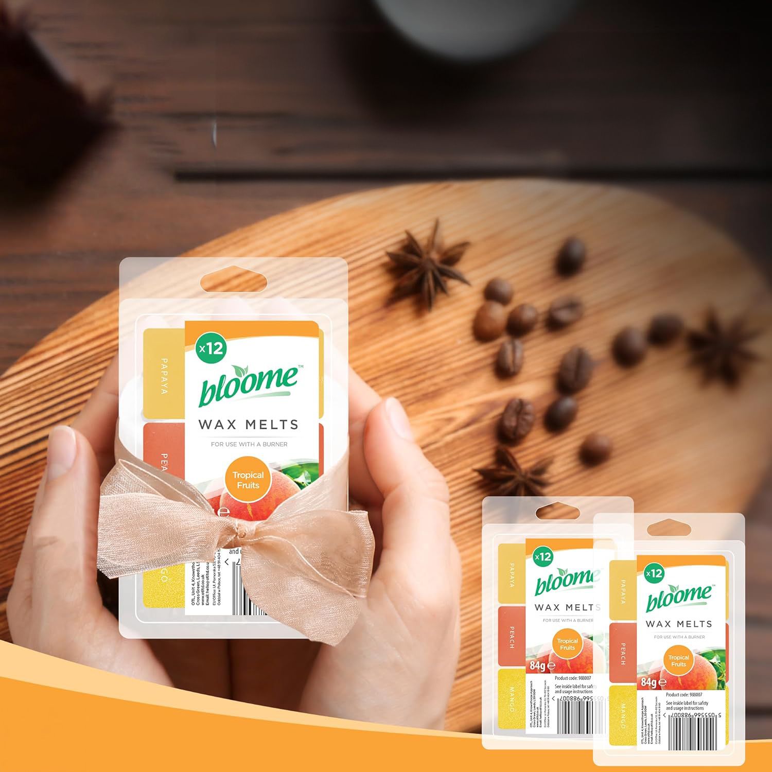 Zestaw 12 aromatycznych wosków o zapachu owoców tropikalnych (papaja, brzoskwinia, mango), przeznaczony do stosowania w kominkach do aromaterapii. Intensywne aromaty wspierają zdrowie emocjonalne i fizyczne, tworząc w pomieszczeniach atmosferę relaksu bez konieczności użycia wody.
