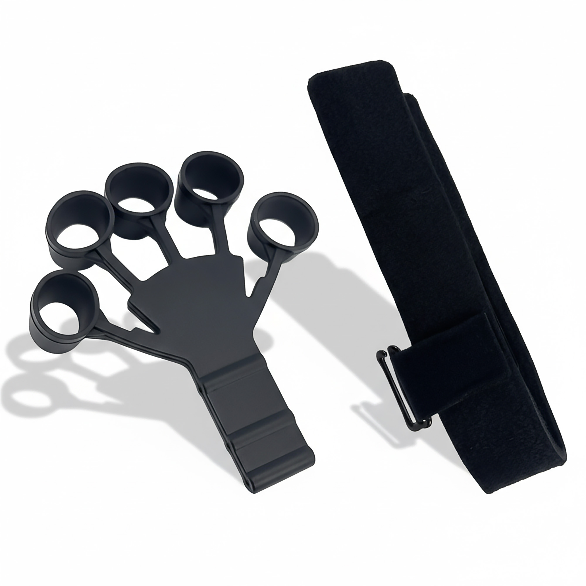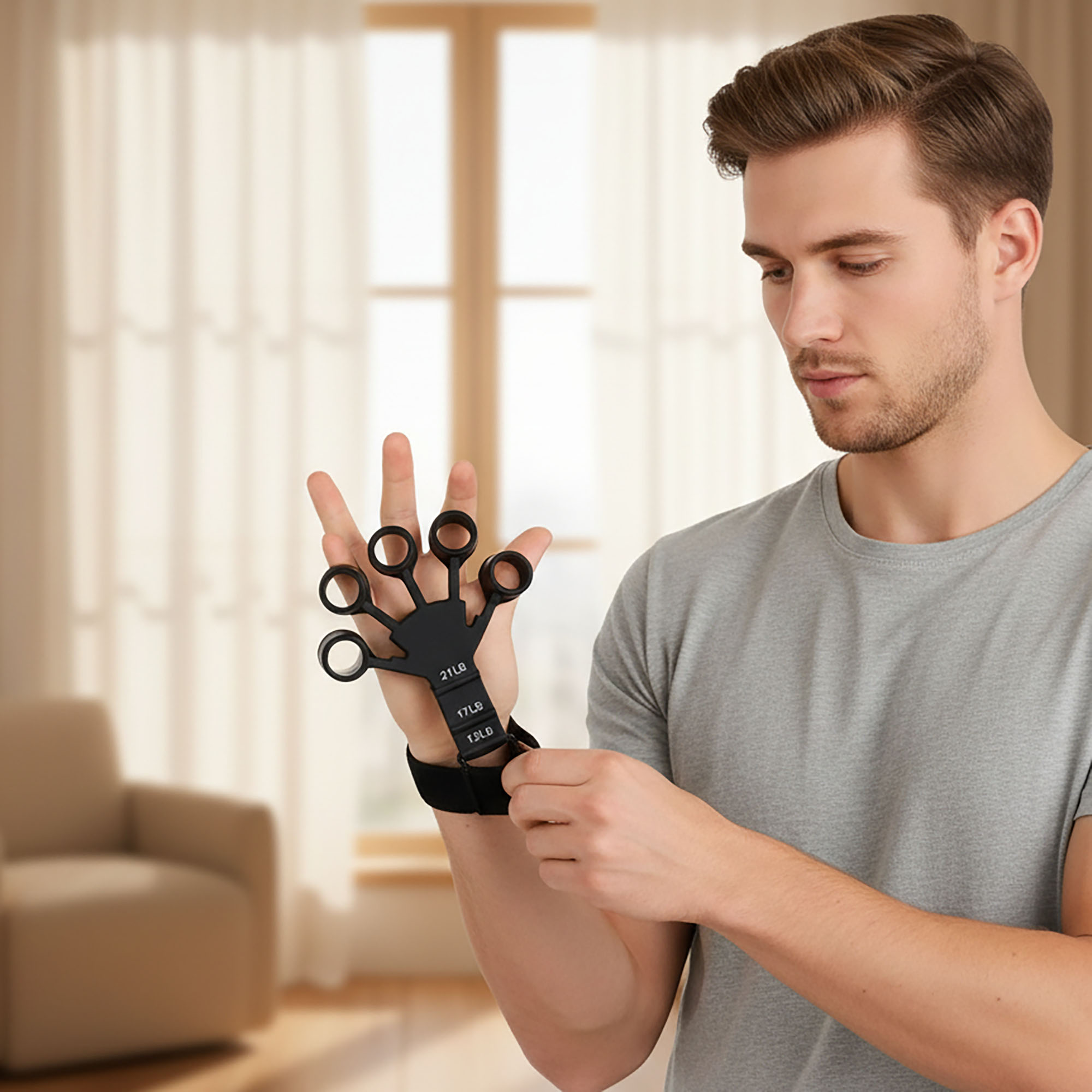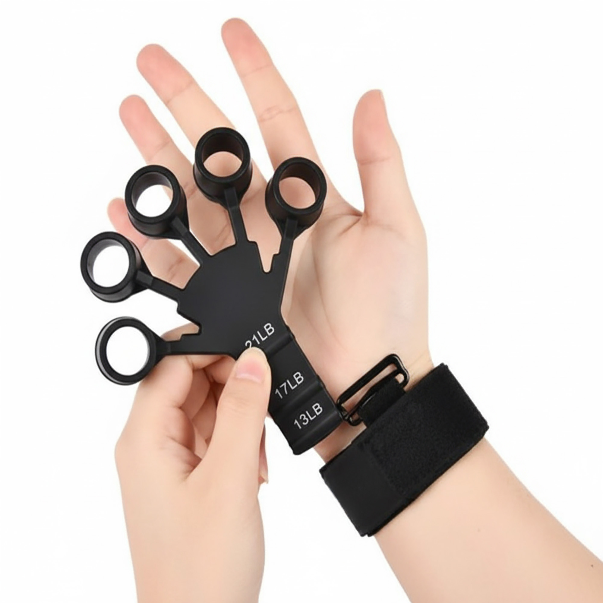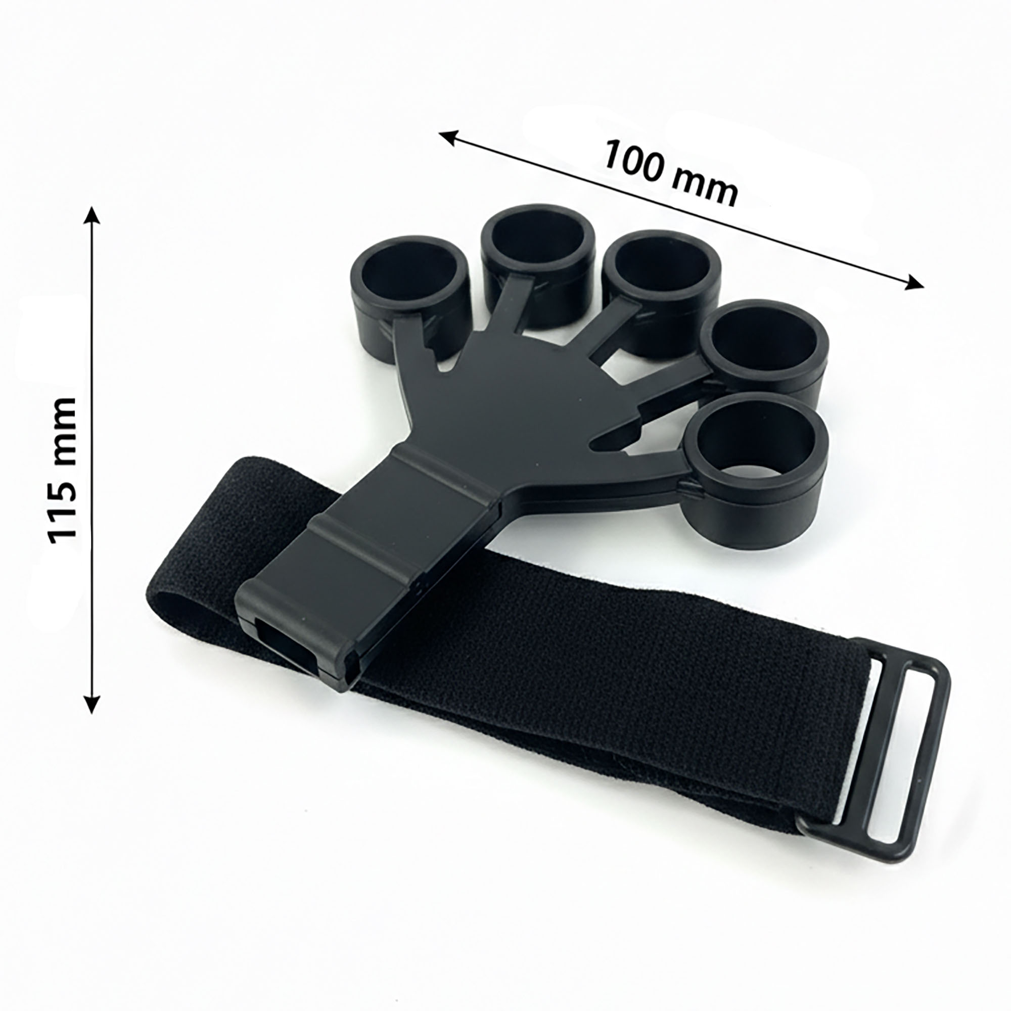- Instrukcja zakładania: Najpierw załóż opaskę na nadgarstek i mocno zaciśnij rzep. Następnie włóż palce w otwory silikonowej nakładki. Wybierz odpowiedni poziom oporu, zahaczając metalowy haczyk o właściwy otwór na pasku.