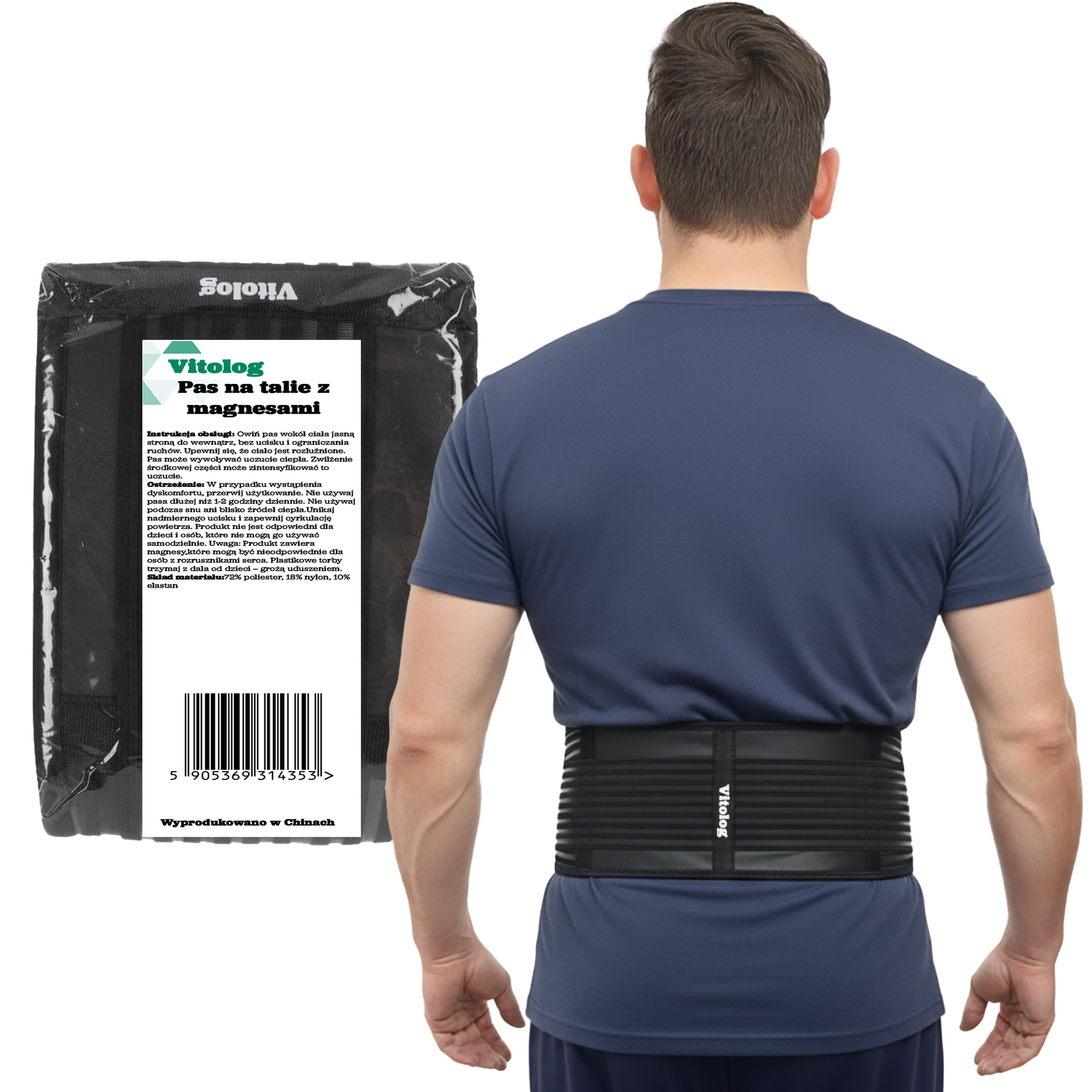 Pas stabilizujący odcinek lędźwiowo-krzyżowy kręgosłupa marki Vitolog to zaawansowane rozwiązanie ortopedyczne łączące stabilizację mechaniczną z magnetoterapią. Konstrukcja oparta jest na wytrzymałej mieszance materiałów syntetycznych (poliester, nylon, elastan), która zapewnia odpowiednią kompresję oraz trwałość produktu. Kluczowym elementem pasa jest system 20 zintegrowanych magnesów pokrytych powłoką turmalinową. Rozmieszczenie punktów magnetycznych (8 w panelu przednim, 12 w panelu tylnym) gwarantuje oddziaływanie pola magnetycznego na cały obwód pasa biodrowego. Turmalin, jako materiał piezoelektryczny, pod wpływem temperatury ciała emituje fale dalekiej podczerwieni (FIR), co wspomaga termoregulację w obszarze aplikacji. Produkt przeznaczony jest do profilaktyki przeciążeń oraz wspomagania rehabilitacji w stanach zwyrodnieniowych i pourazowych.