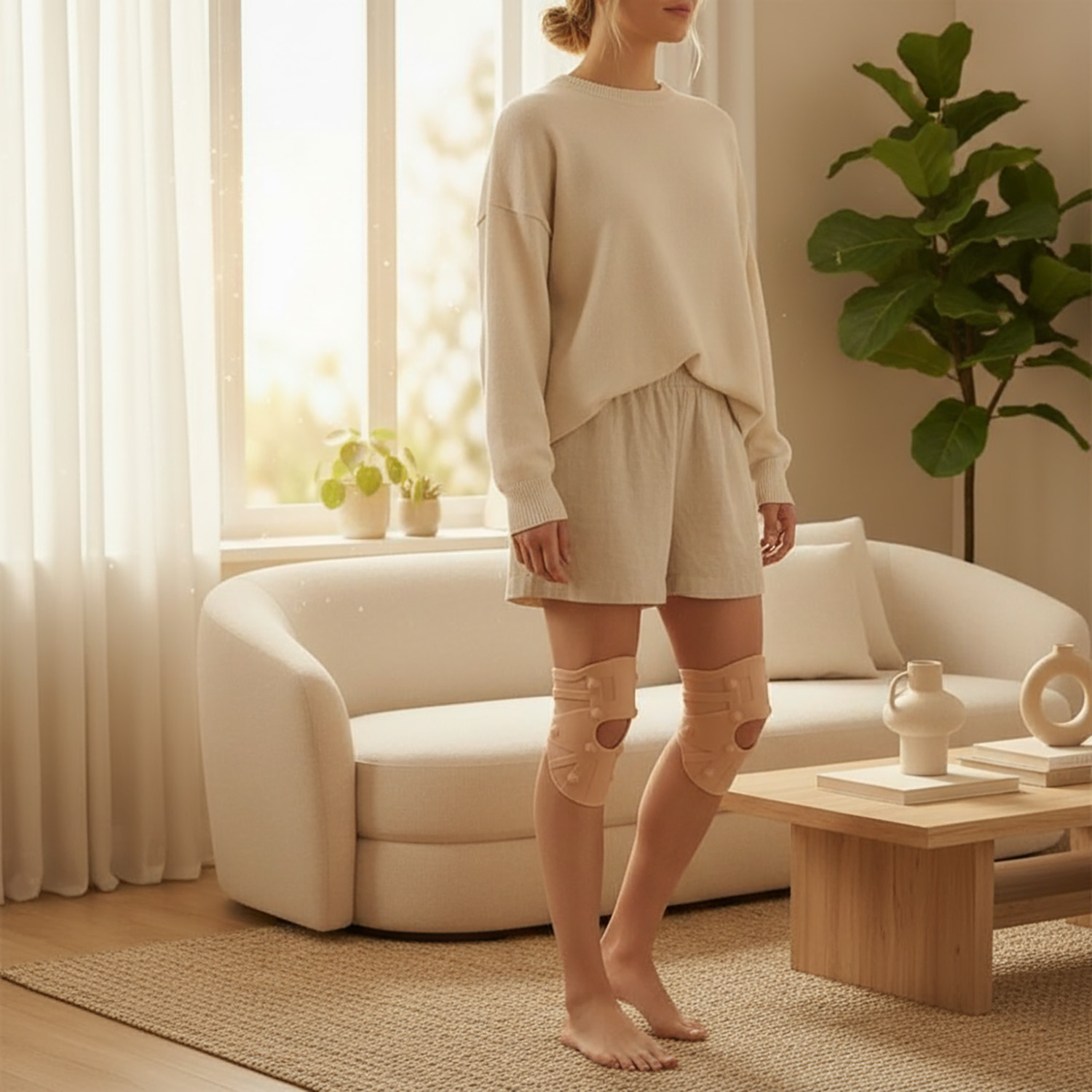 - Dyskretny i estetyczny wygląd: Dzięki zastosowaniu materiału w kolorze cielistym oraz bardzo cienkiej strukturze, opaska jest niemal niewidoczna pod ubraniem, co pozwala na jej komfortowe noszenie w pracy czy podczas spotkań.