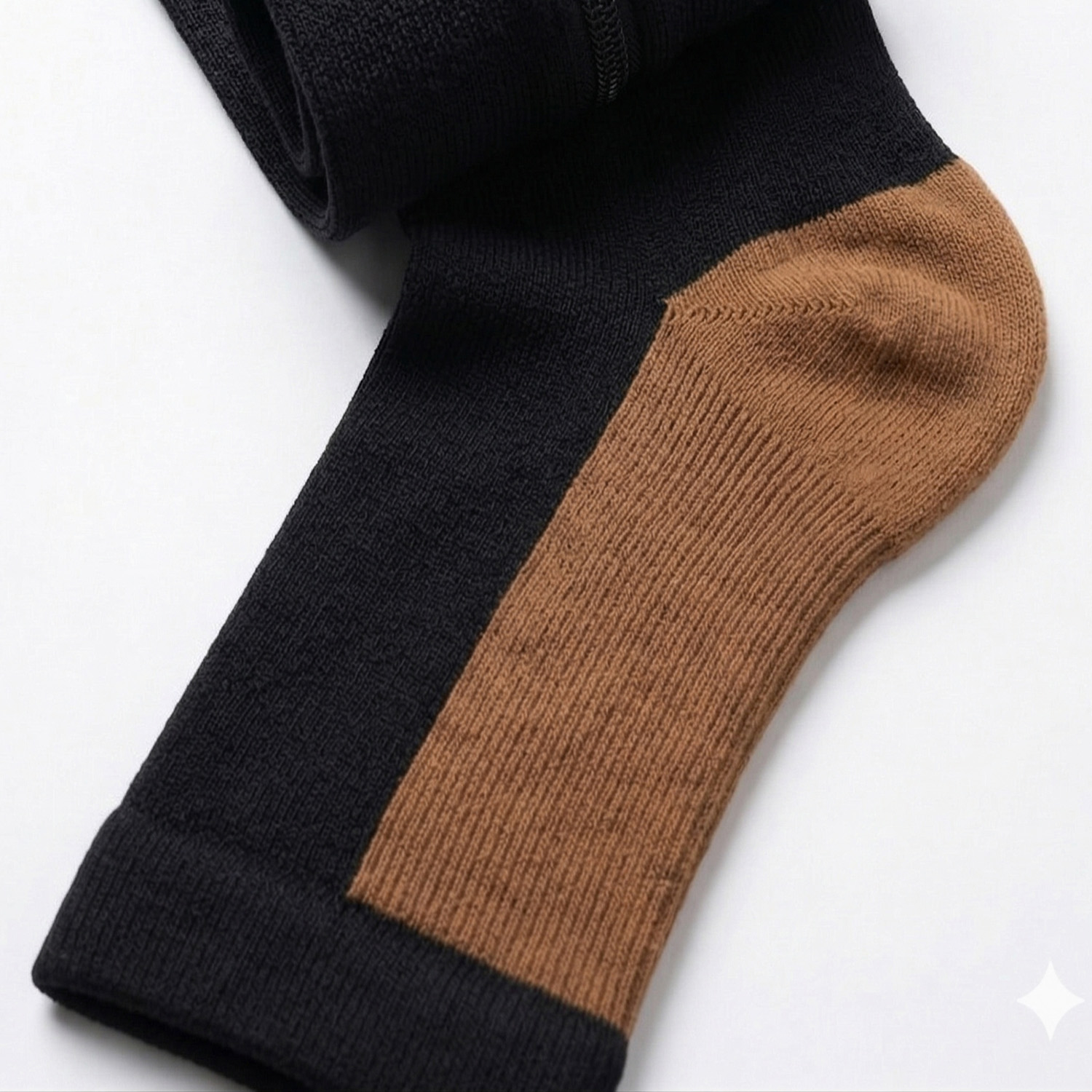 - Wzmocniona strefa pięty i łuku stopy: Charakterystyczny, brązowy splot o prążkowanej strukturze w obrębie stopy zapewnia dodatkową stabilizację oraz zwiększoną odporność materiału na przecieranie w miejscach najbardziej narażonych na nacisk.