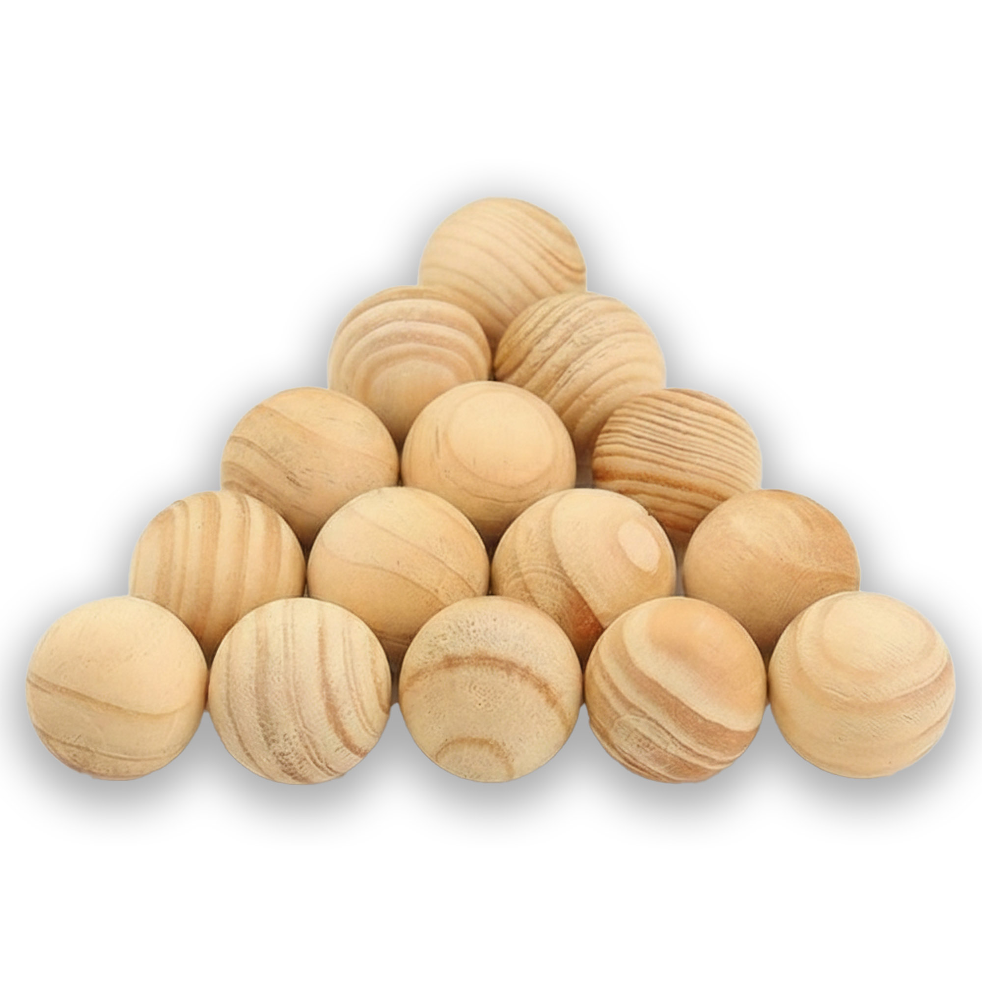 - Estetyka i ekologia: Produkt wykonany jest w 100% z surowego drewna, bez lakierów i sztucznych barwników. Jasna, naturalna struktura słojów drewna sprawia, że kulki prezentują się elegancko w każdym wnętrzu – od nowoczesnych szaf po rustykalne komody.