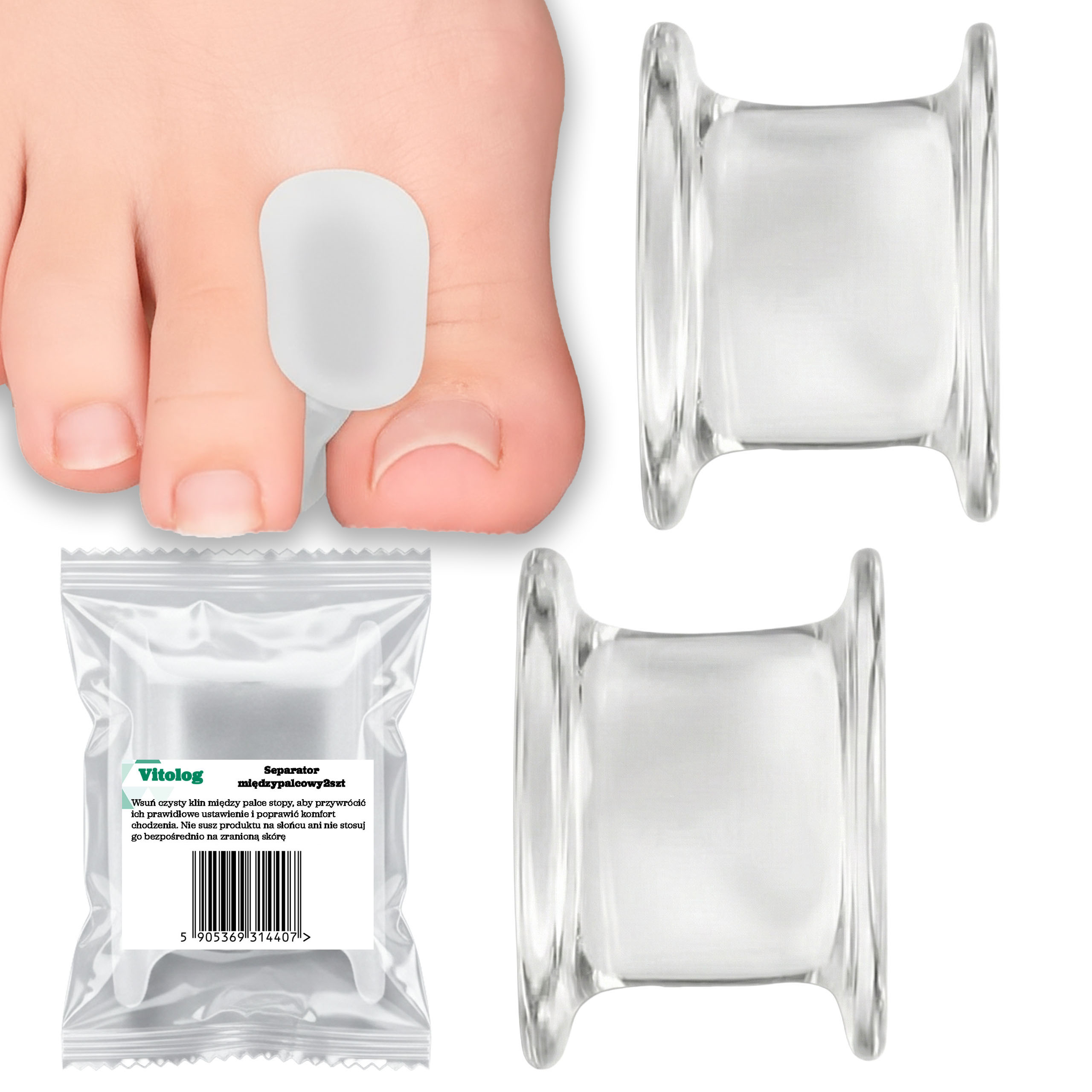 - Pełna dyskrecja i transparentność: Dzięki bezbarwnej strukturze, separator jest niemal niewidoczny na stopie. Możesz go nosić zarówno w eleganckich szpilkach czy sportowym obuwiu, nie martwiąc się o estetykę.