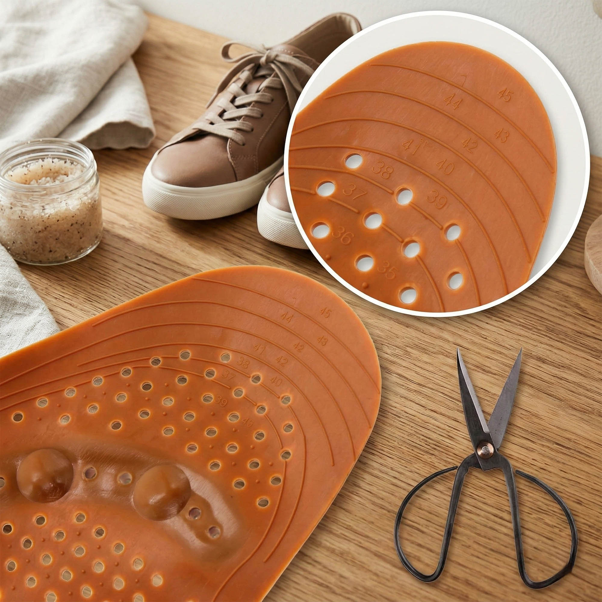 - Uniwersalność i Personalizacja: Na spodniej części wkładek znajdują się precyzyjne linie pomocnicze z numeracją od 35 do 45. Pozwala to na idealne docięcie wkładki do każdego rodzaju buta, bez obawy o postrzępienie krawędzi.