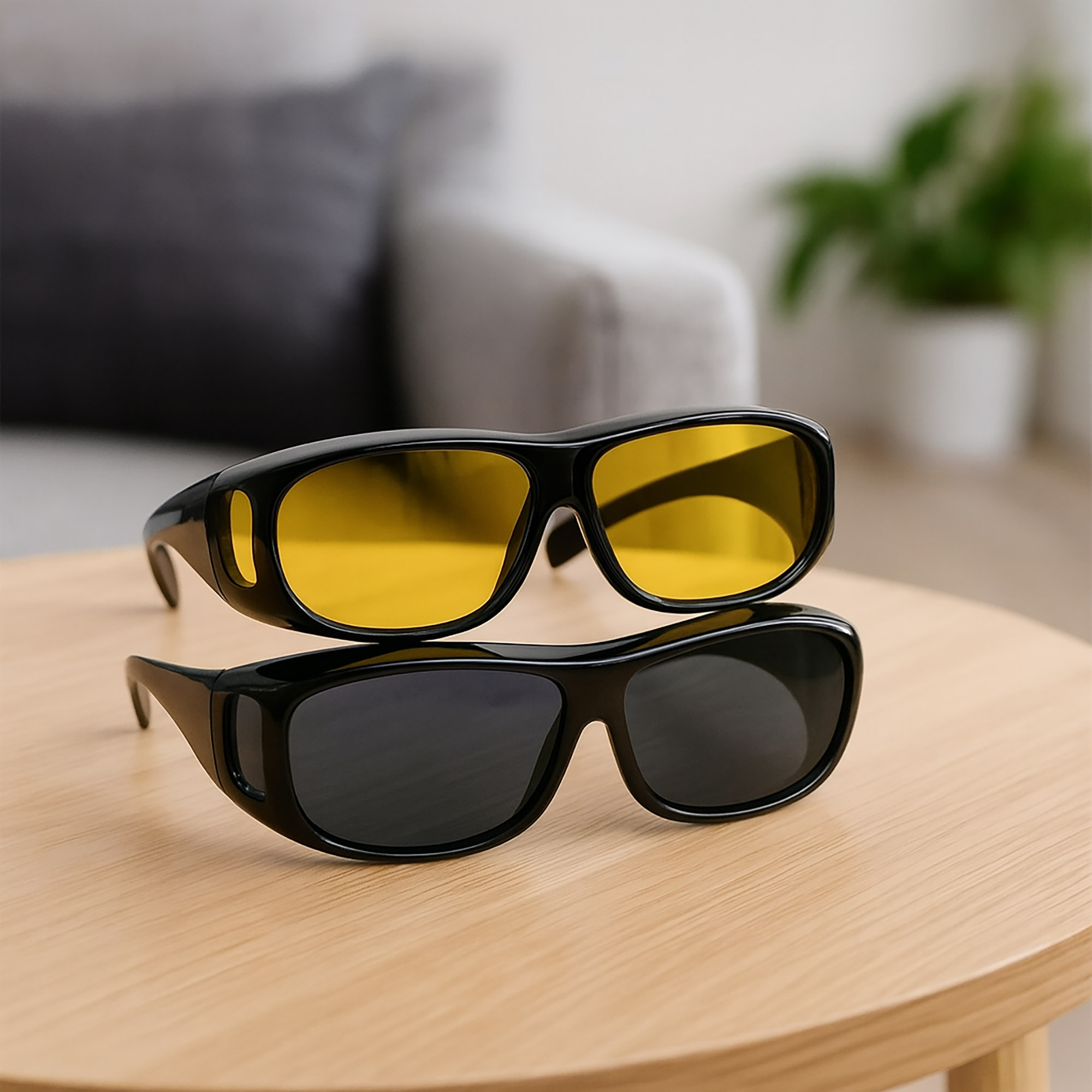 Zestaw okularów do jazdy samochodem w różnych warunkach atmosferycznych. Skutecznie poprawiają widoczność podczas prowadzenia samochodu. W zestawie znajdują się dwie pary okularów – jedne do jazdy w dzień, drugie do jazdy w nocy. Okulary hamują, eliminują światło, odblaski jednocześnie nie ograniczając pola widzenia. Działają na zasadzie zwiększenia kontrastu obrazu oraz redukcji odbicia światła. Dzięki temu poprawiają komfort oraz bezpieczeństwo jazdy podczas deszczu, ograniczonej widoczności, mgły, opadów śniegu, mocnym nasłonecznieniu. Zmniejszają zmęczenie wzroku podczas podróży.