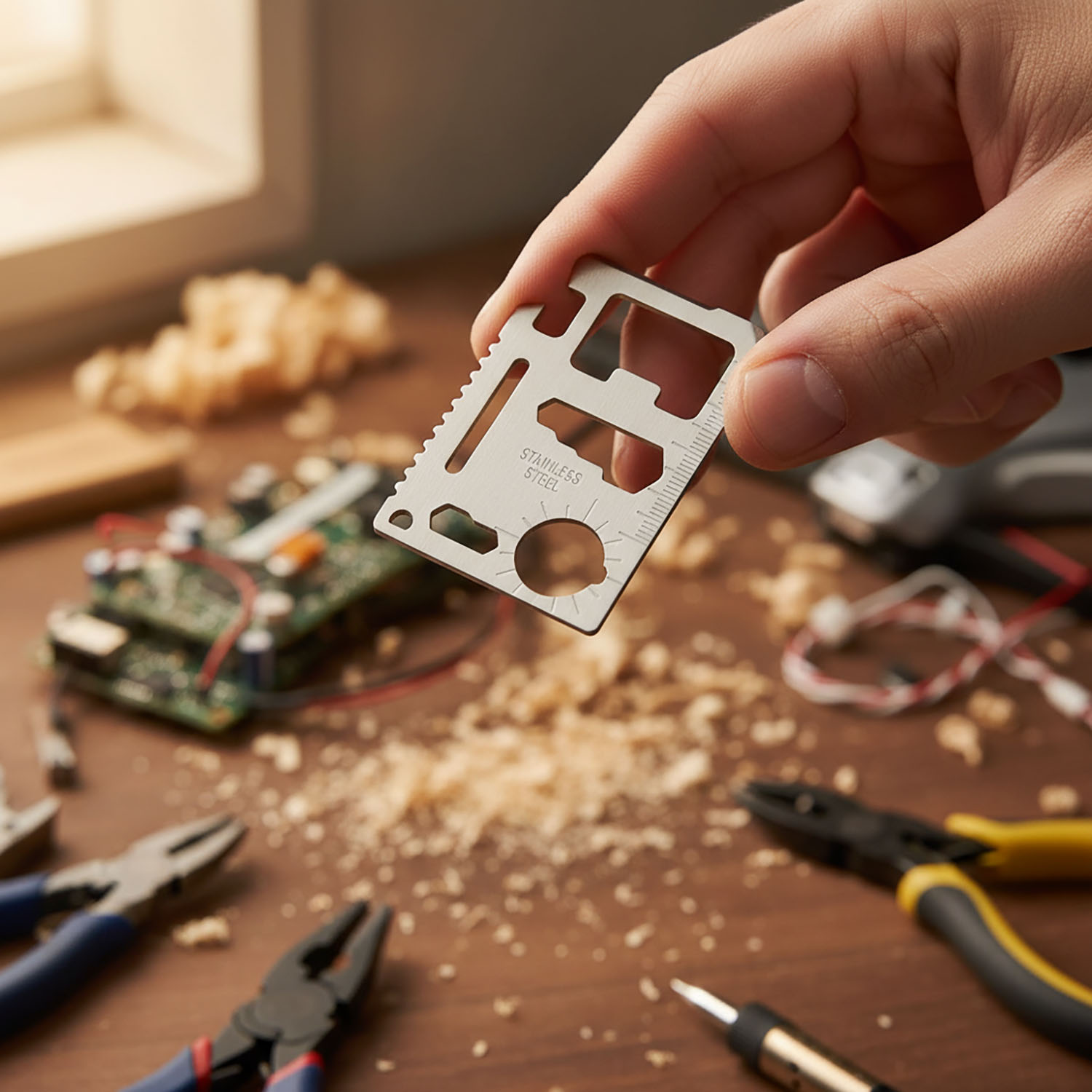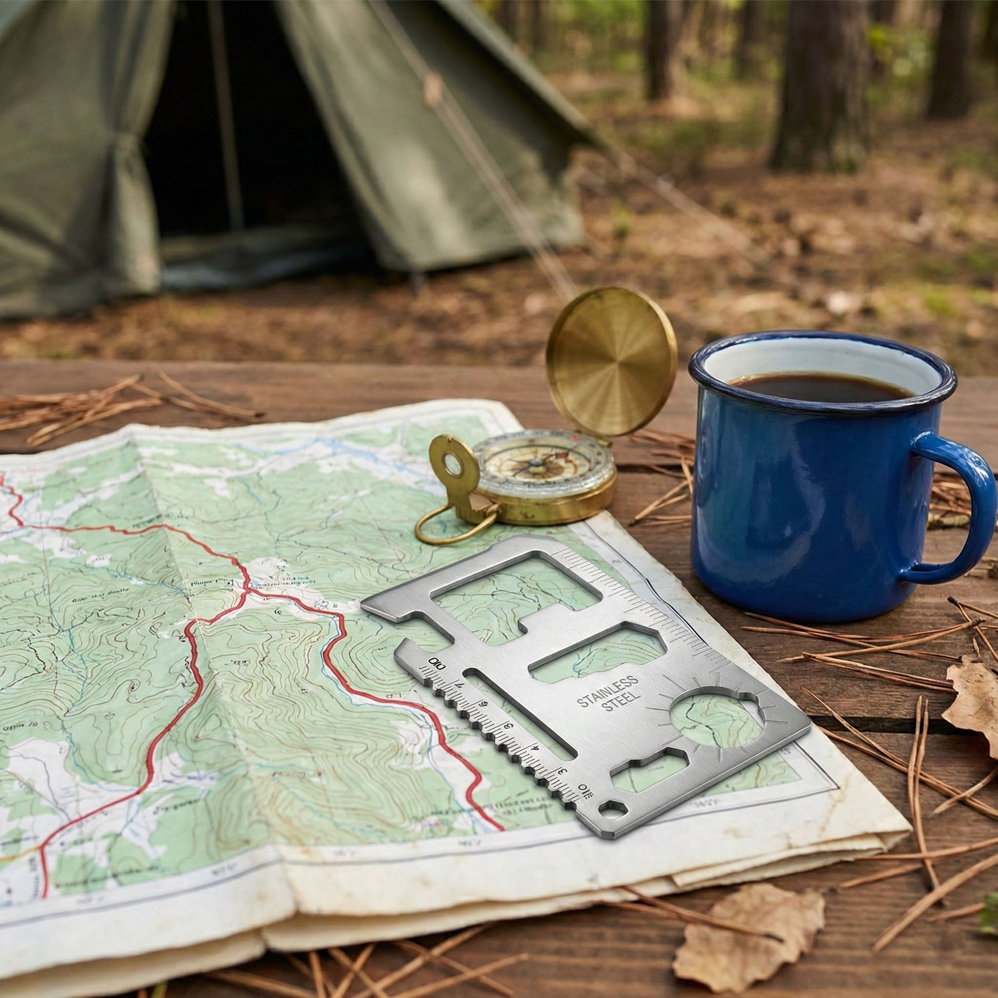 - Wszechstronność 11w1: Od otwieracza do butelek po wskaźnik mapowy – każdy centymetr tej karty został zagospodarowany, aby służyć Ci pomocą w terenie, warsztacie i w kuchni polowej.