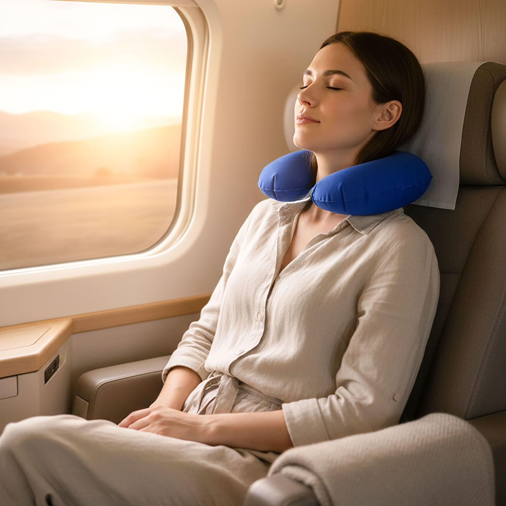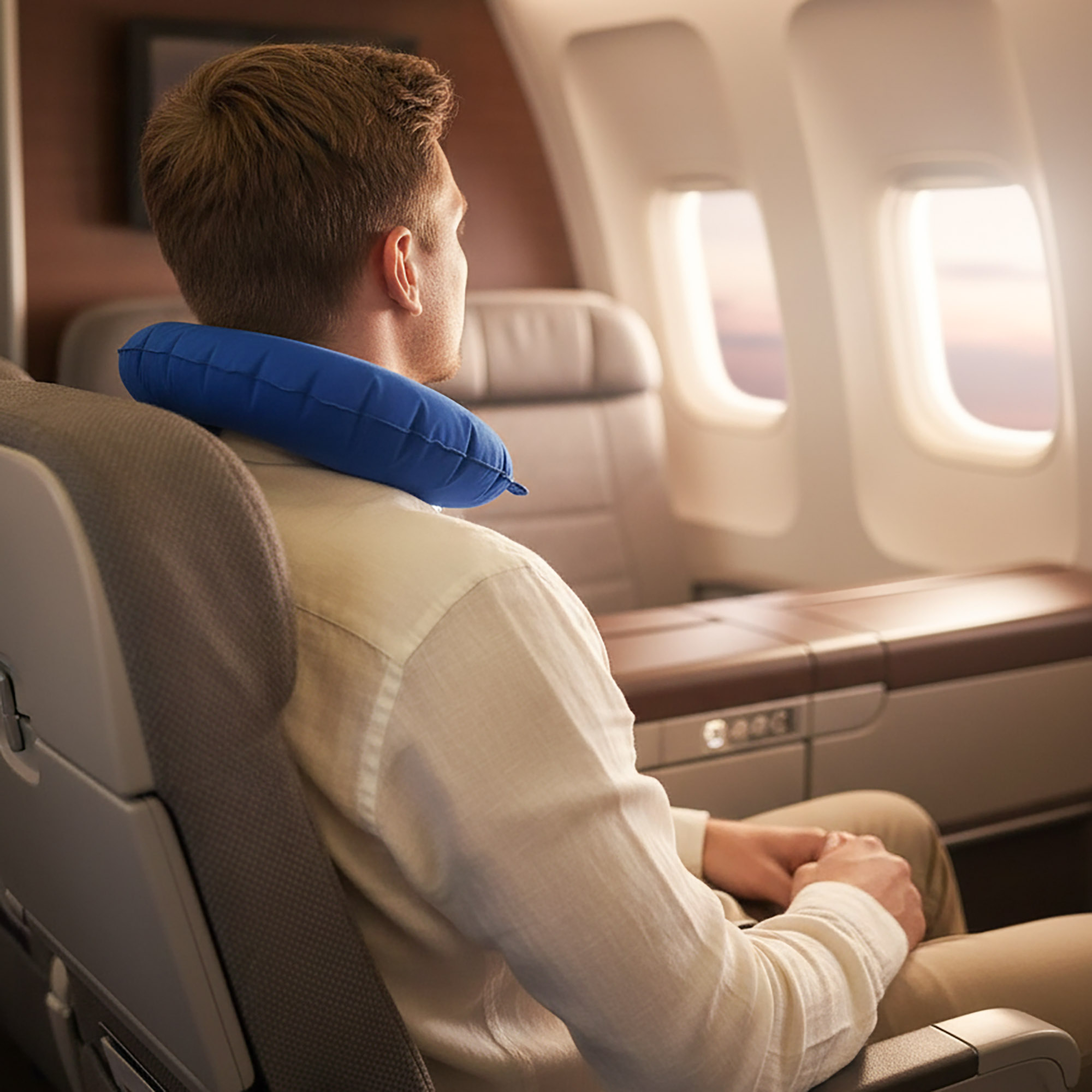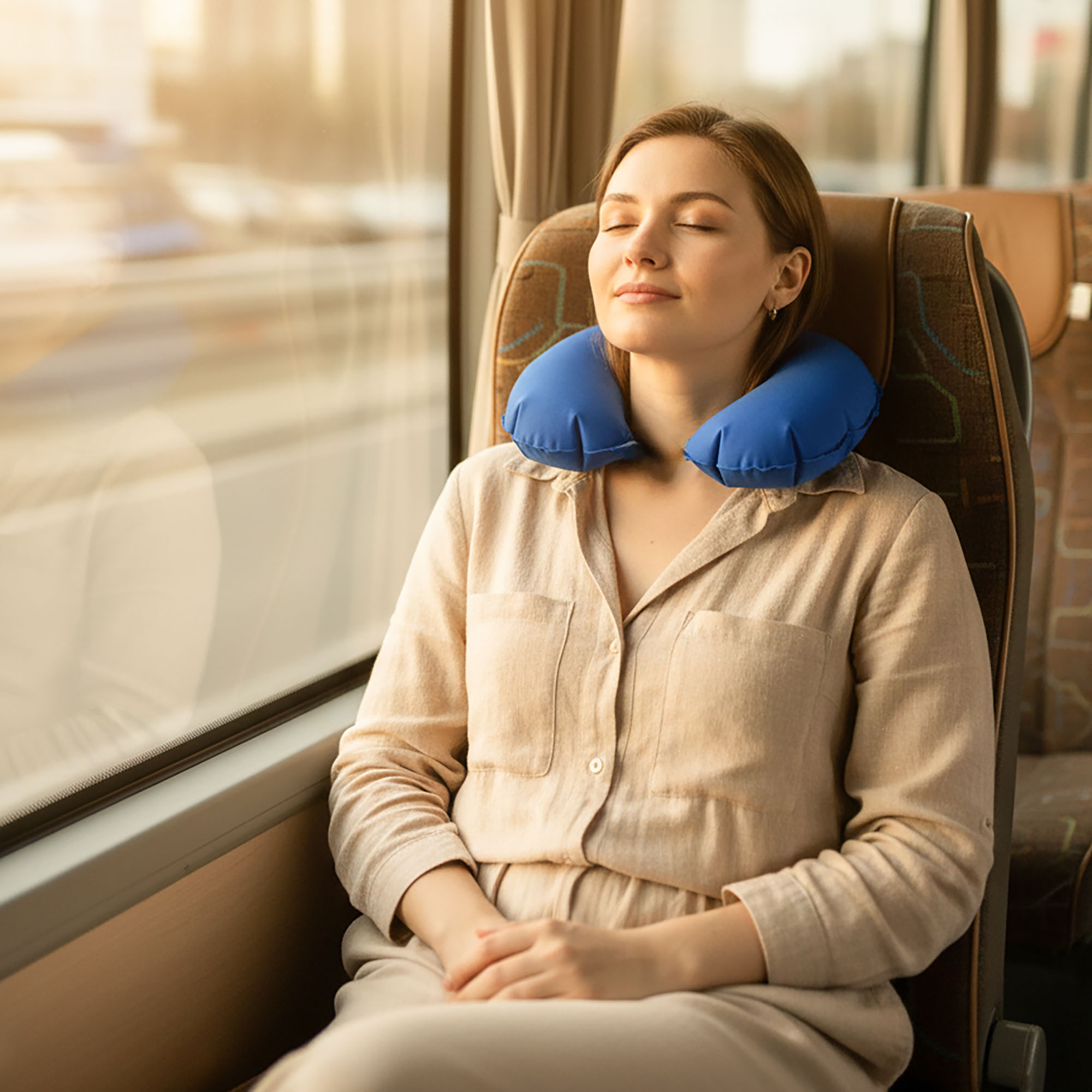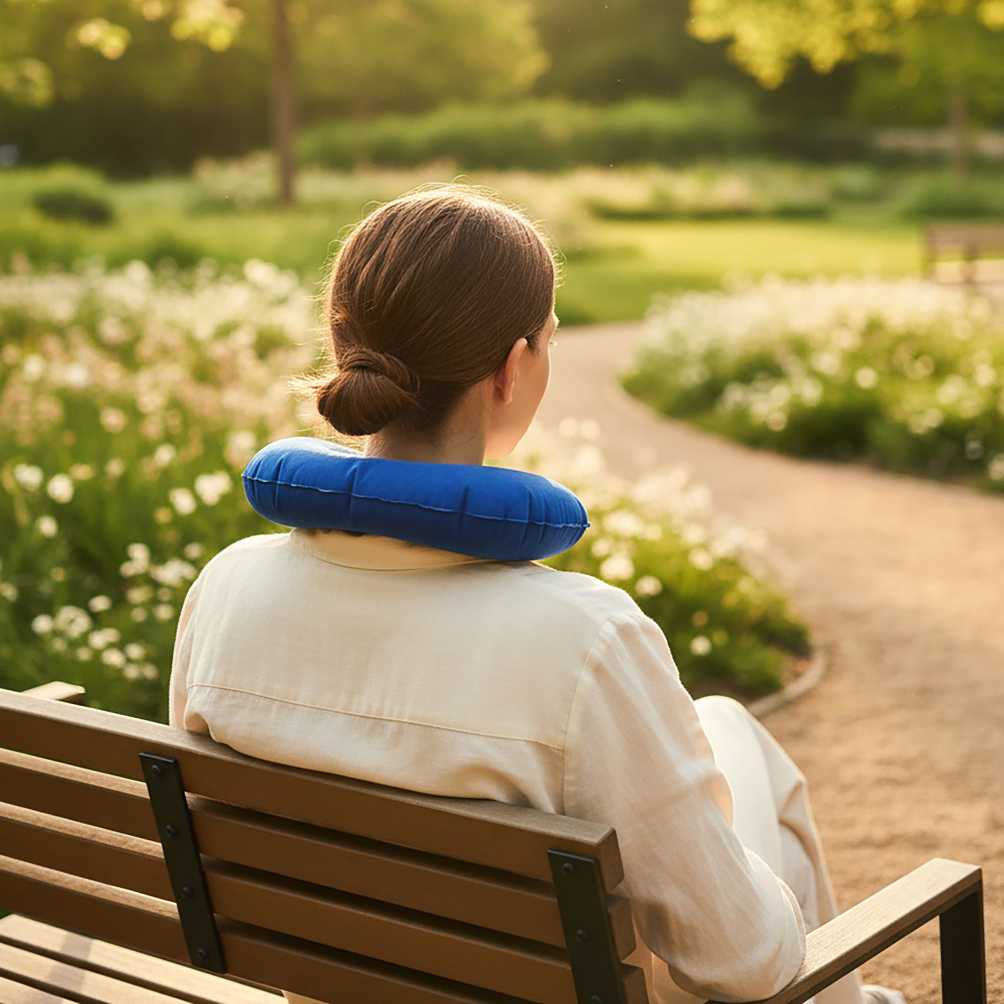 Dmuchana poduszka podróżna marki Vitolog to inteligentne rozwiązanie typu „neck support”, które stabilizuje kręgosłup szyjny i pozwala na regenerujący sen w samolocie, aucie czy pociągu.
