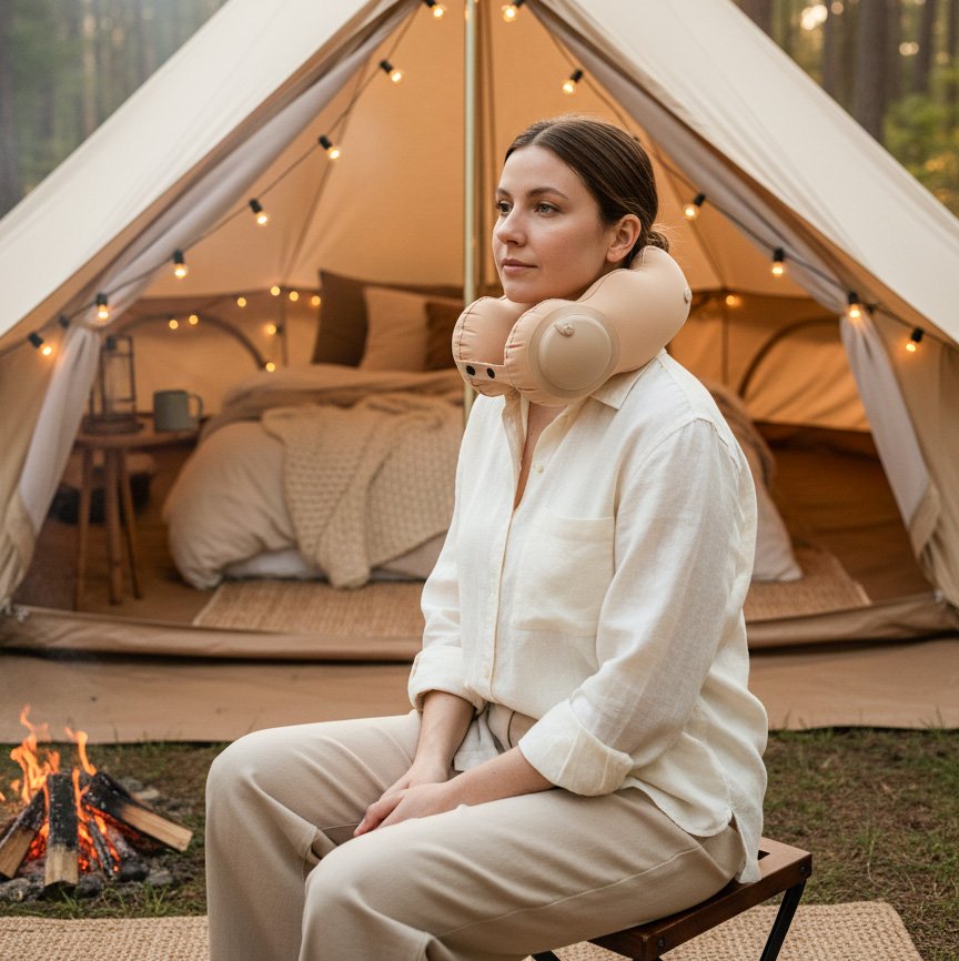 Miłośnicy kempingu i glampingu: Jak widać na załączonych fotografiach, poduszka świetnie sprawdza się podczas relaksu przed namiotem lub przy ognisku, oferując domowy komfort w polowych warunkach.