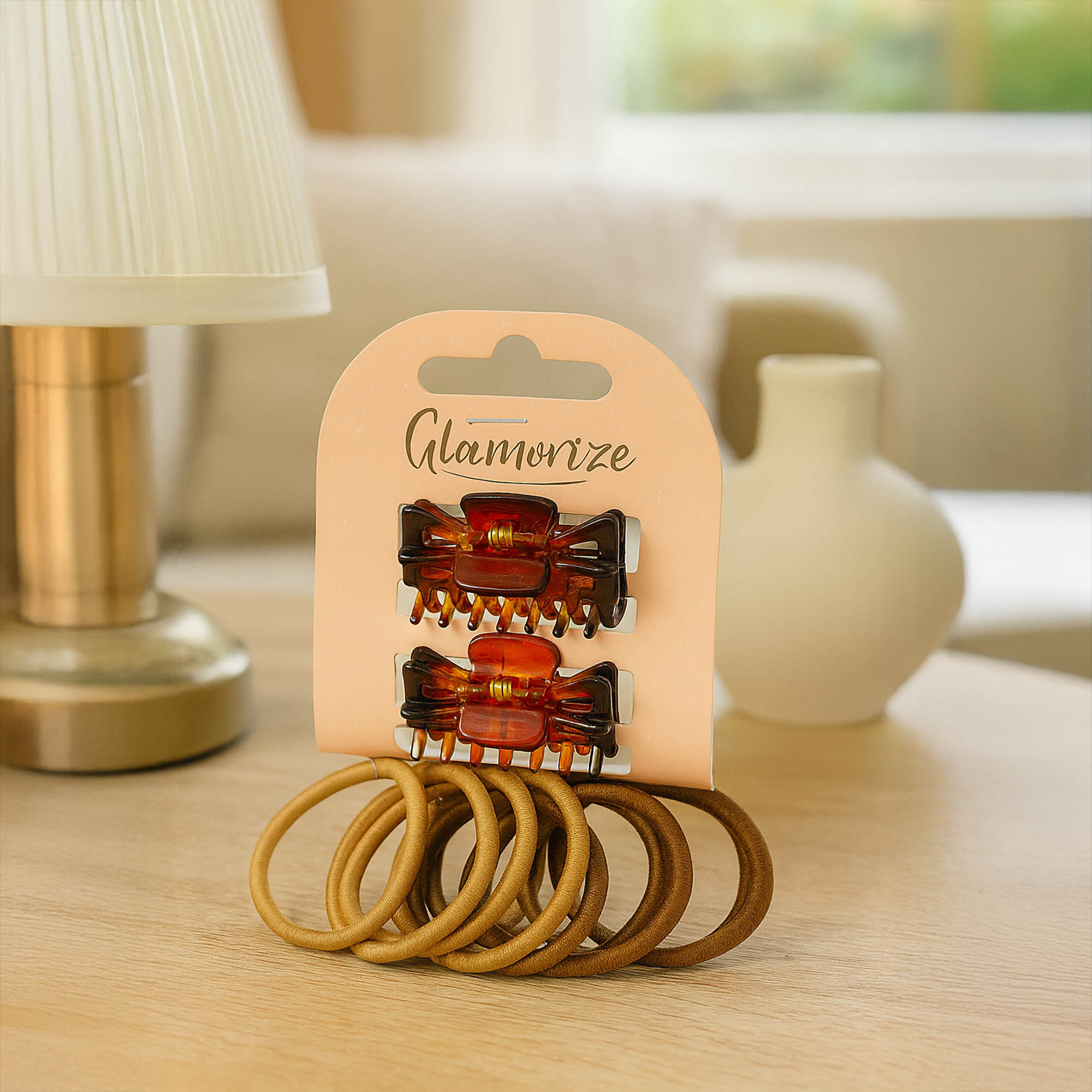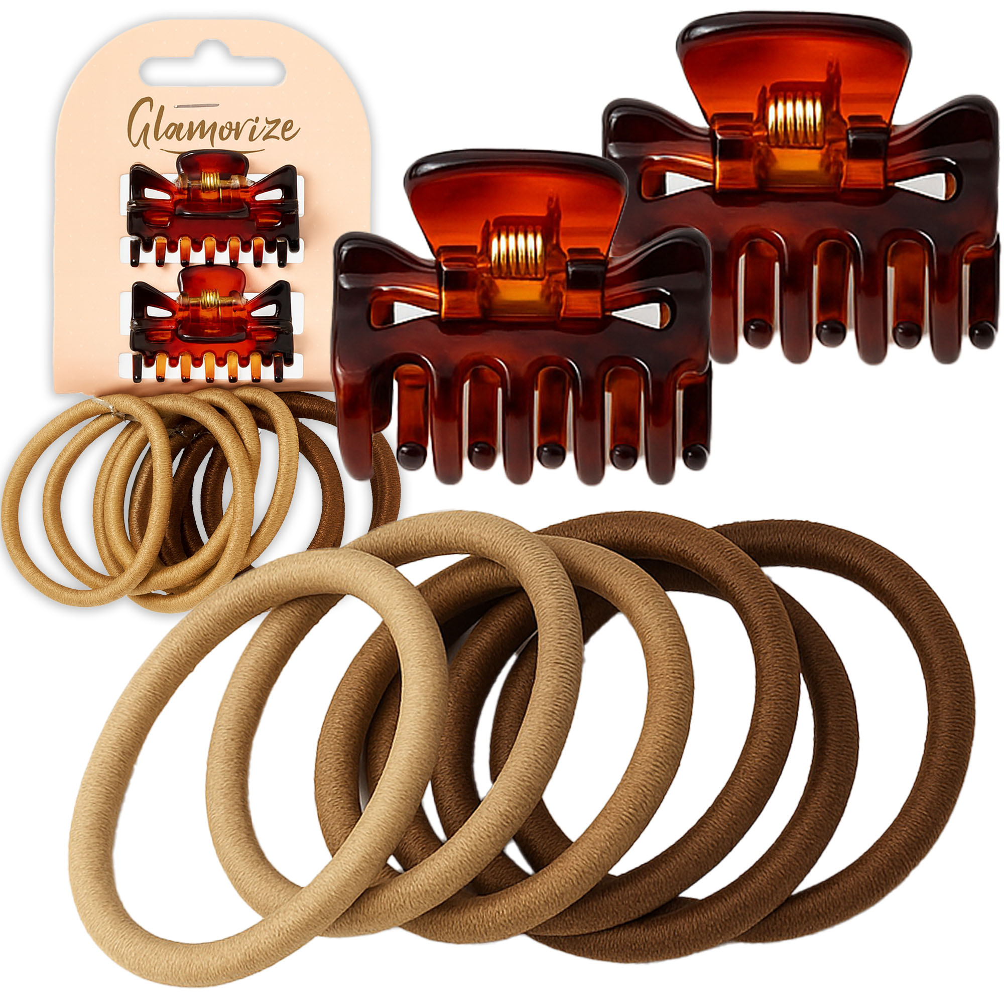 Kompletny zestaw 10 akcesoriów do stylizacji włosów, składający się z 2 klamerek oraz 8 elastycznych gumek w kolorach brązowym i beżowym. Wykonany z trwałego połączenia tworzywa sztucznego, metalu i gumy, zestaw zapewnia stabilne upięcie bez uszkadzania struktury włosa.