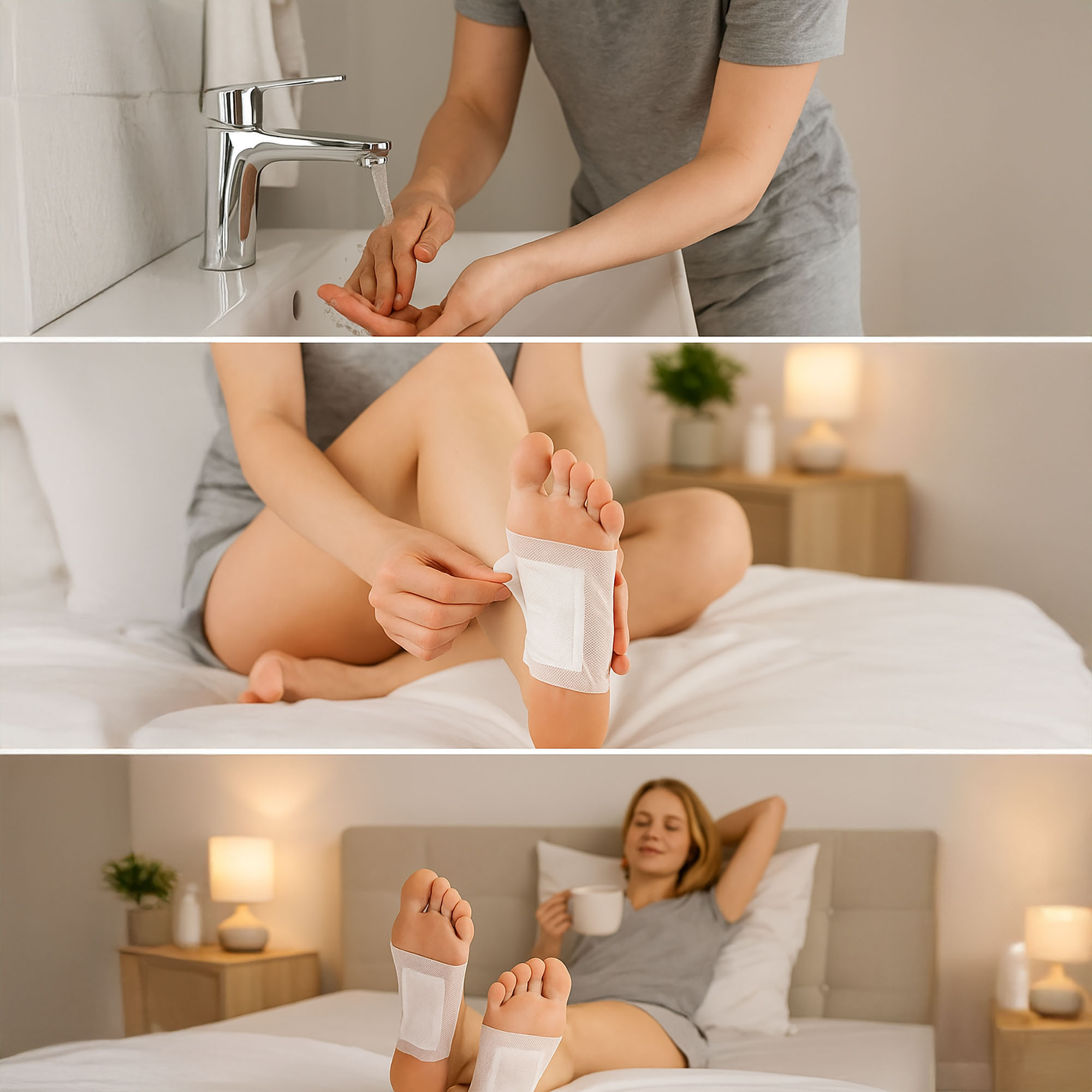 - Przygotowanie skóry: Przed nałożeniem plastra umyj stopy w ciepłej wodzie i dokładnie je osusz (jak pokazano na instrukcji graficznej). Zapewni to lepszą przyczepność i otworzy pory skóry.