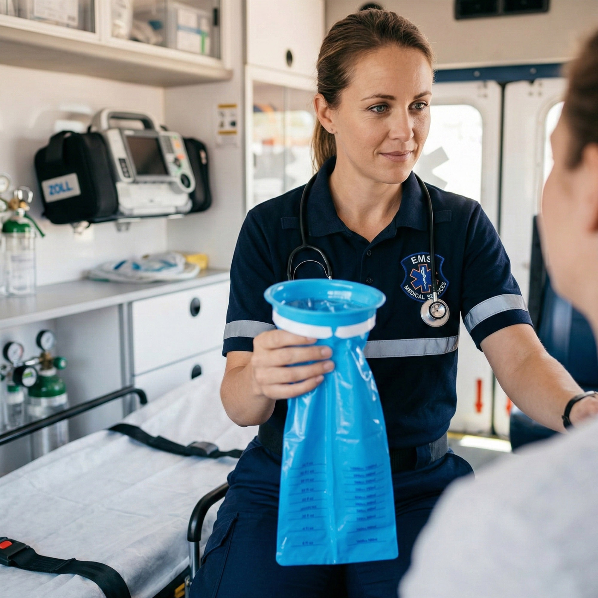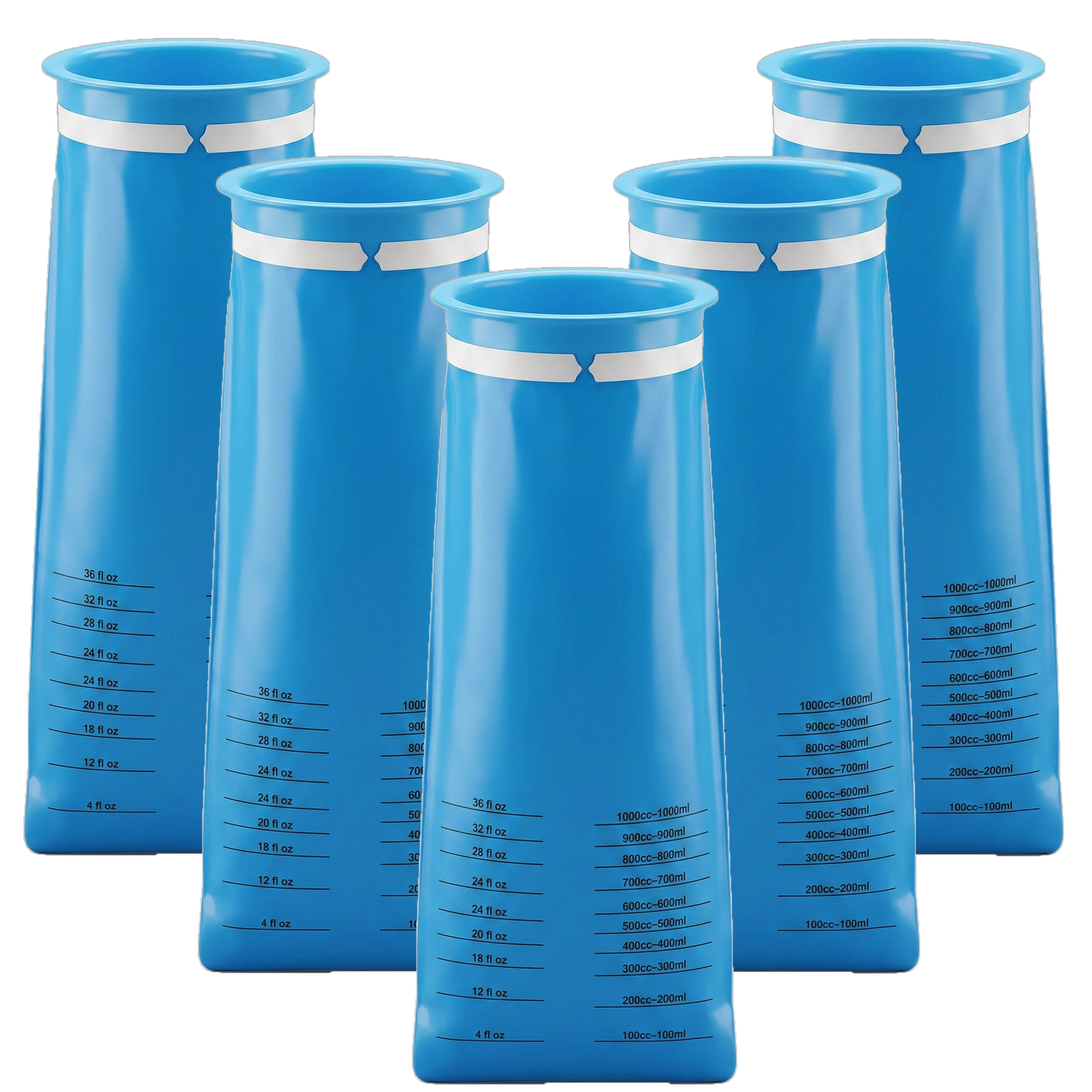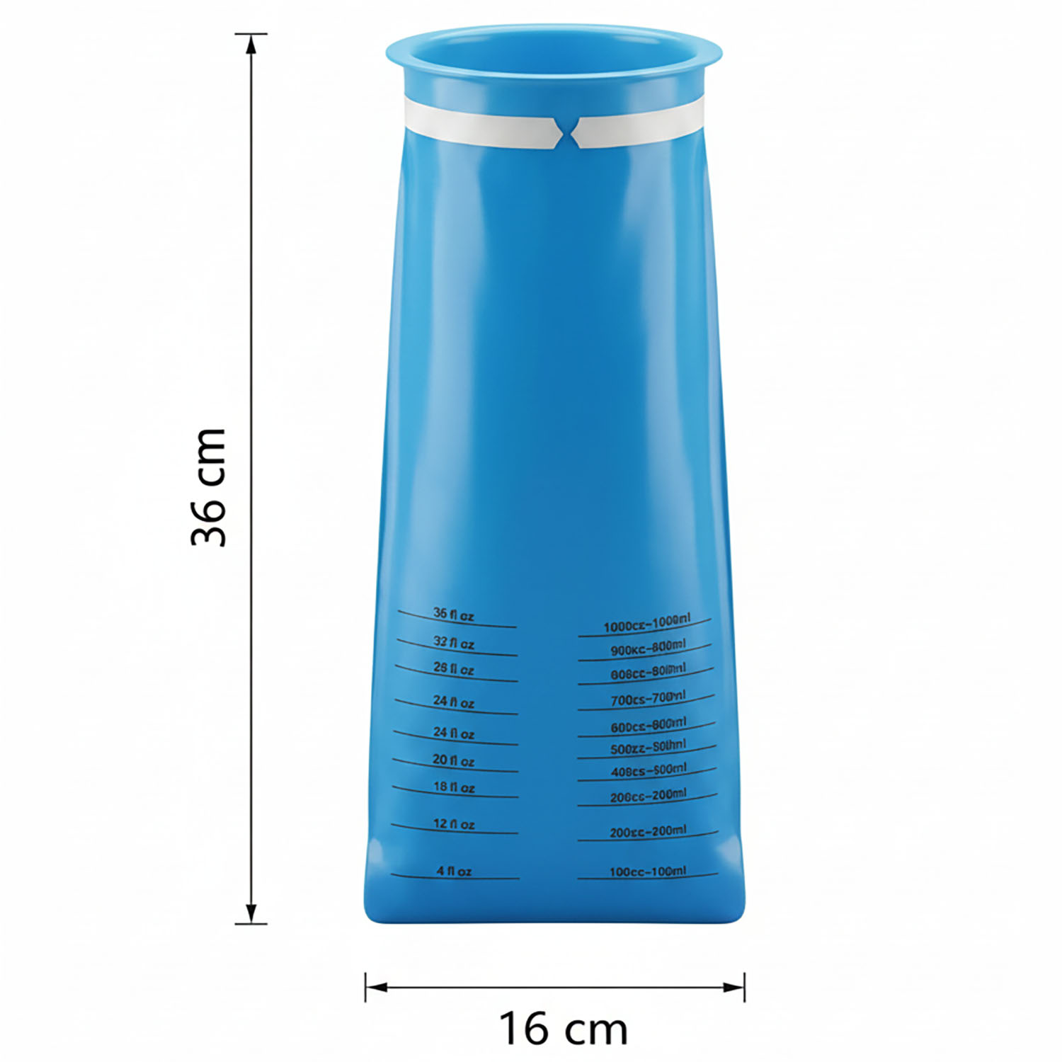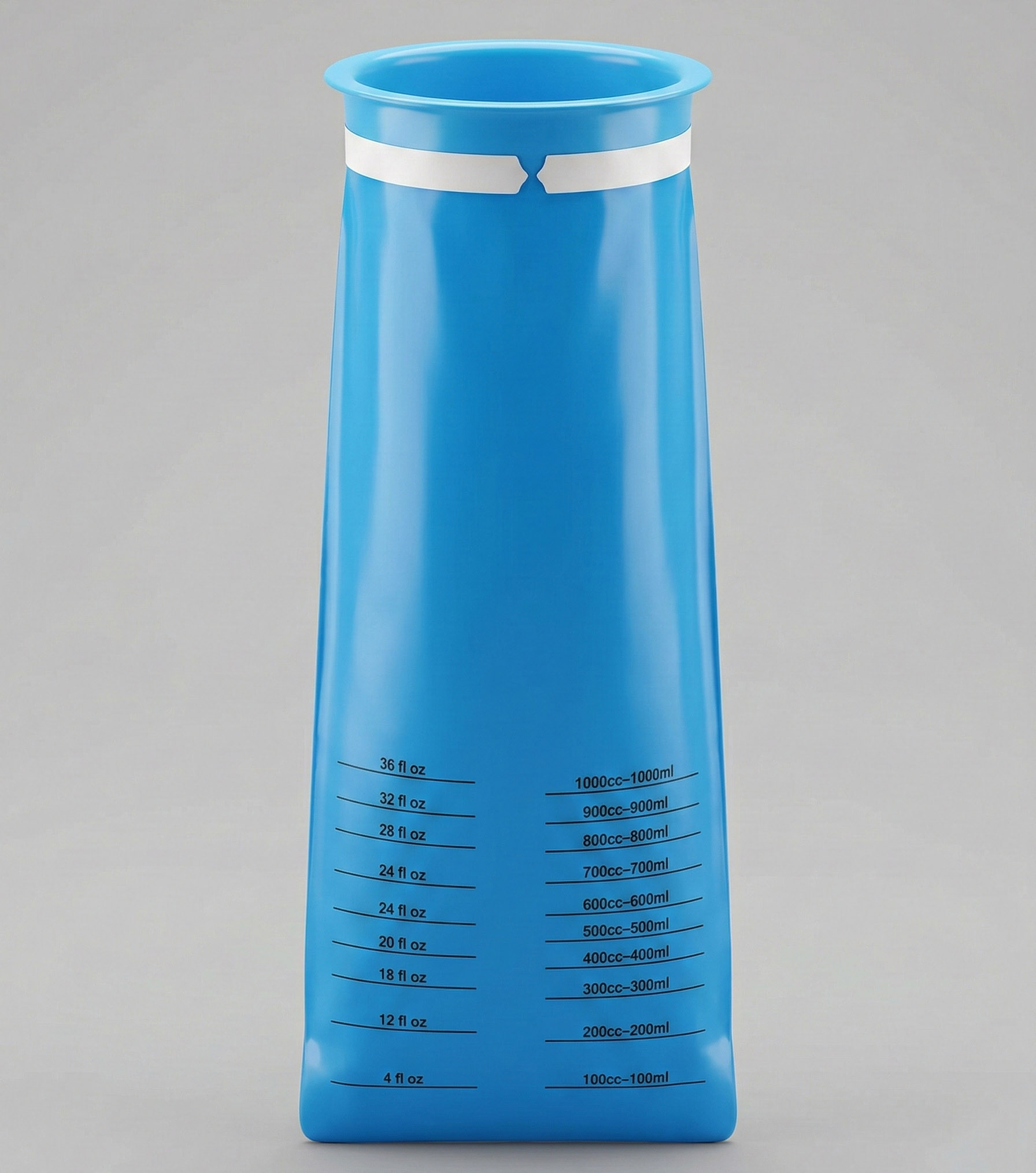 - Precyzyjna skala pomiarowa (1000 ml): Na froncie worka znajduje się czytelna miarka (oznaczona w ml oraz fl oz). Jest to kluczowy detal dla personelu medycznego i opiekunów, pozwalający na dokładne monitorowanie objętości płynów, co jest niezbędne przy diagnostyce odwodnienia.