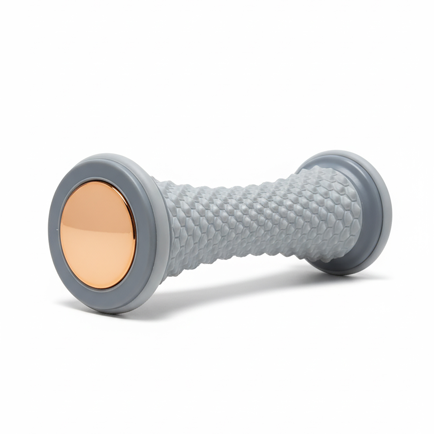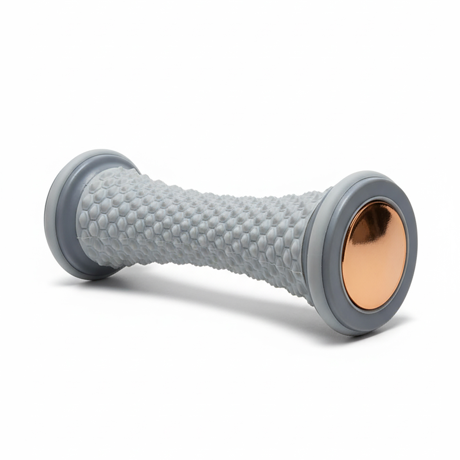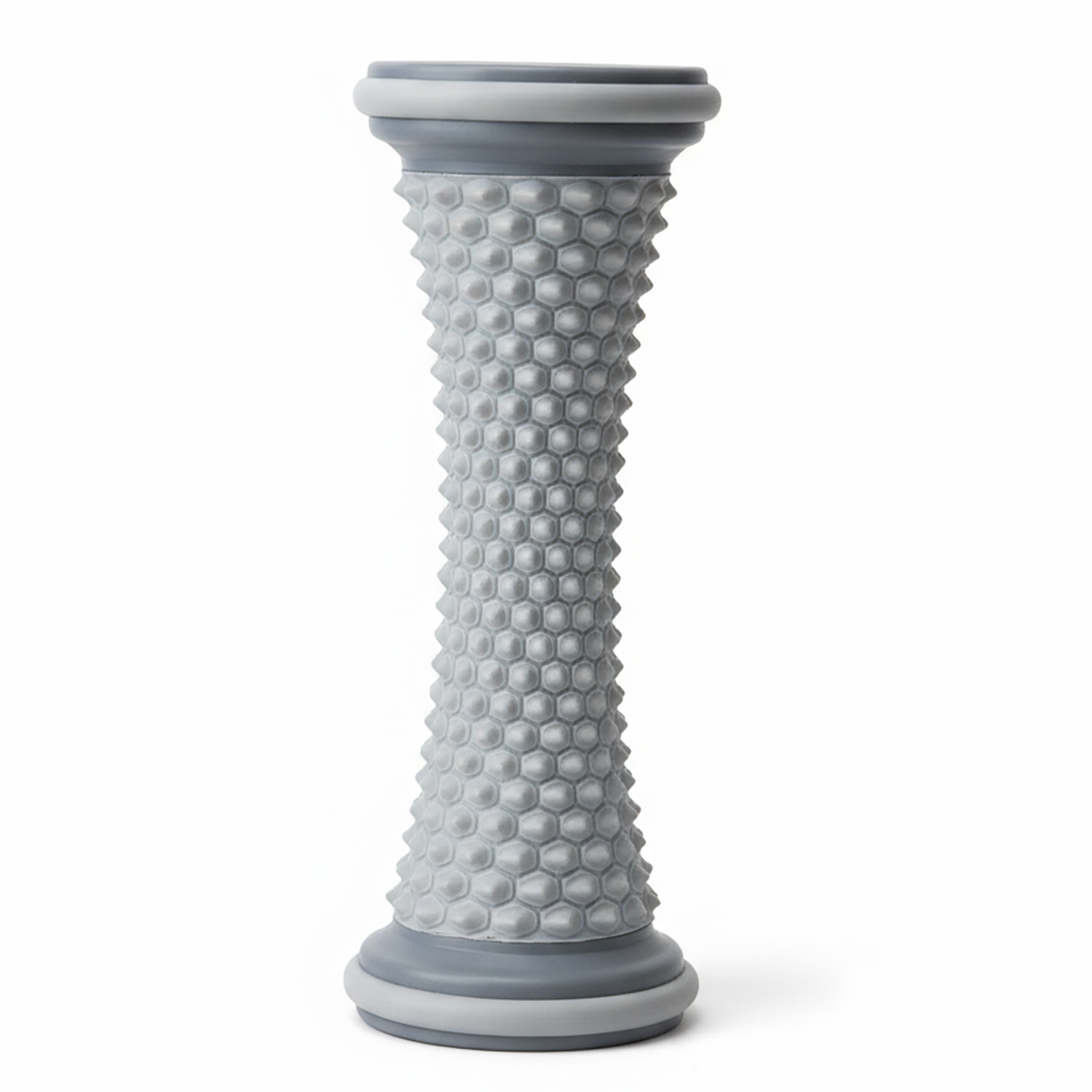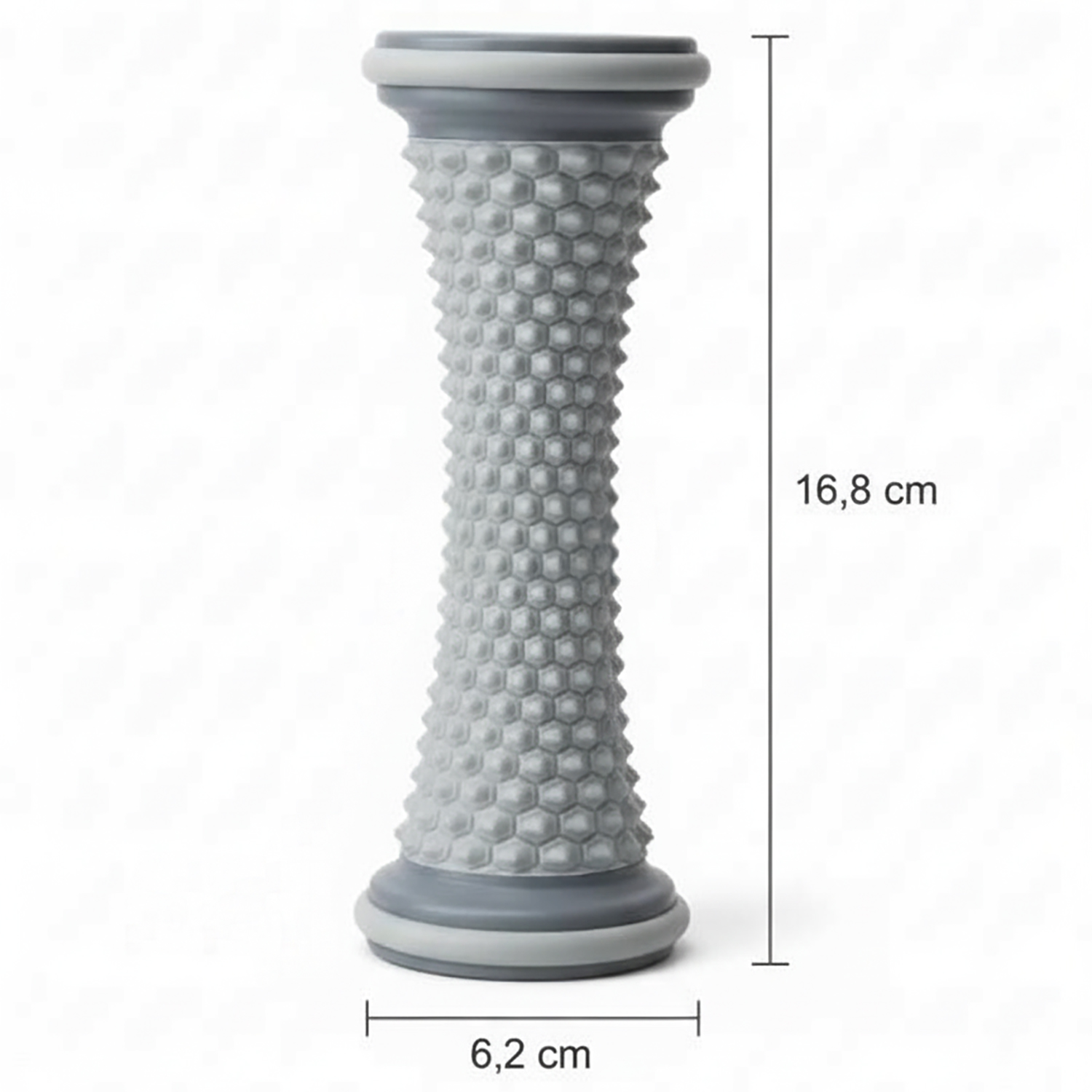 - Ergonomiczny, profilowany kształt: Środkowa część wałka jest delikatnie zwężona, co idealnie dopasowuje się do naturalnego łuku stopy (tzw. wysklepienia). Pozwala to na precyzyjne dotarcie do rozcięgna podeszwowego, przynosząc ulgę w bólach związanych z przeciążeniami.