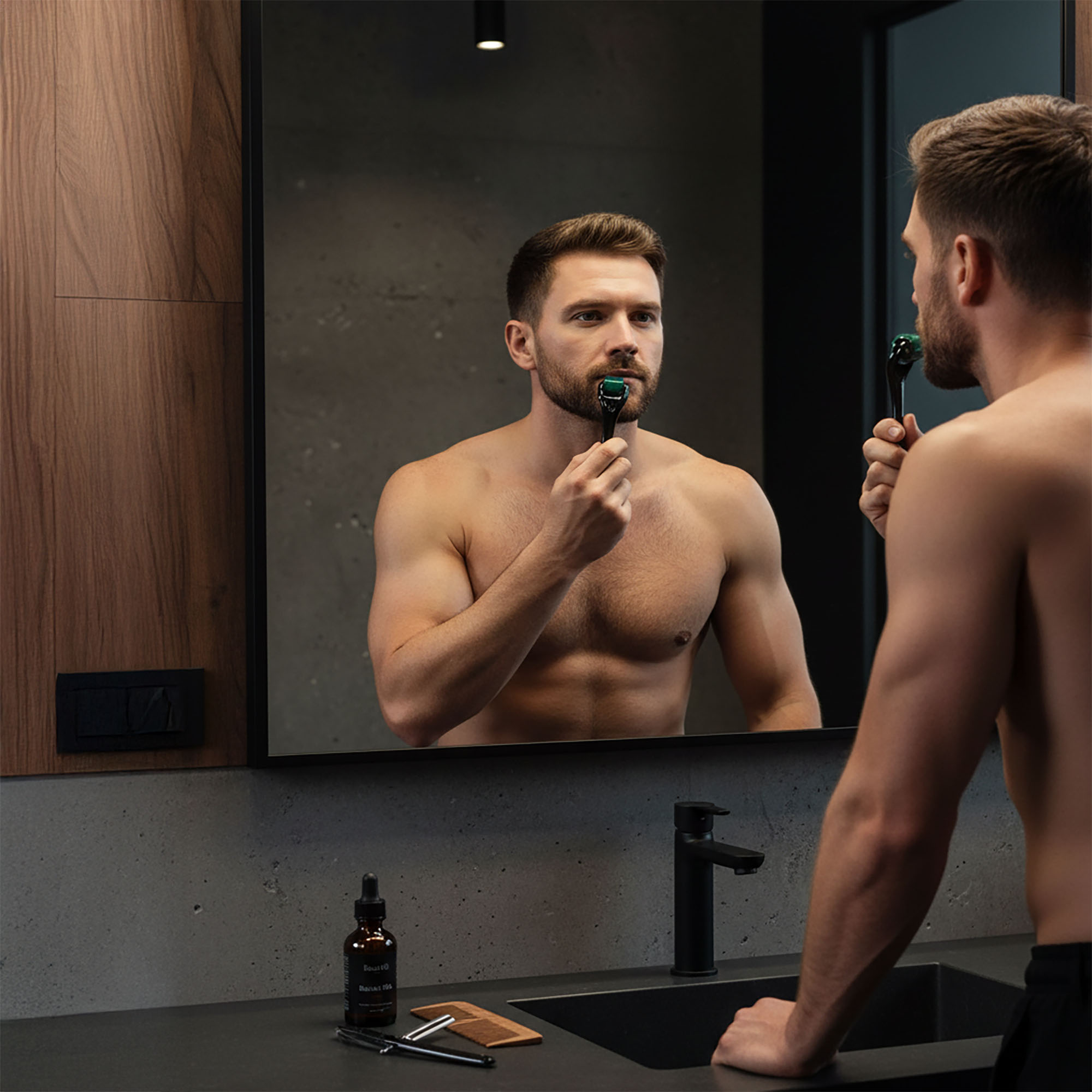 - Wsparcie Wzrostu Włosów i Zarostu: Stymulacja mikrokrążenia w skórze głowy lub w obszarze brody, wywołana przez wałeczek, może przyczynić się do pobudzenia uśpionych mieszków włosowych, wspierając wzrost włosów i brody u mężczyzn.